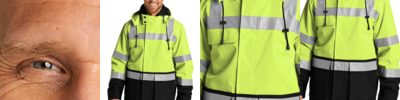 100% polyester 300-denier ripstop shell with durable water-repellent (DWR) finish 100% polyester lining Black bottom front and lower sleeves for a cleaner appearance Shell's fabric waterproof rating: 5000MM Fully seam-sealed shell Adjustable rain hood Durable, reflective 2-inch tape meets ANSI 107 requirements Full-length interior and exterior storm flaps Vented cape back Right chest pocket and retractable ID holder Two lower front pockets Center front zippered pocket to hold a tablet Gusseted cuffs Elastic hem Decoration access pocket in shell Non-ANSI, 8.6-ounce, 100% polyester inner full-zip hoodie Hoodie can be attached inside shell This garment must be fully zipped to be in compliance with ANSI 107 standards